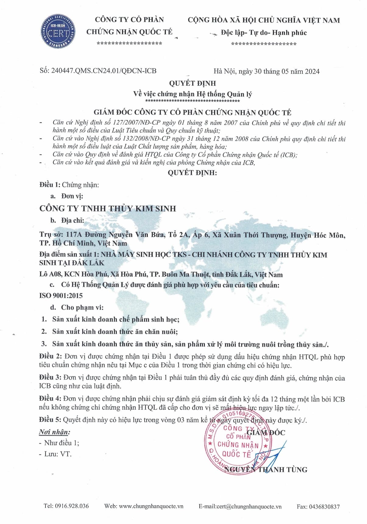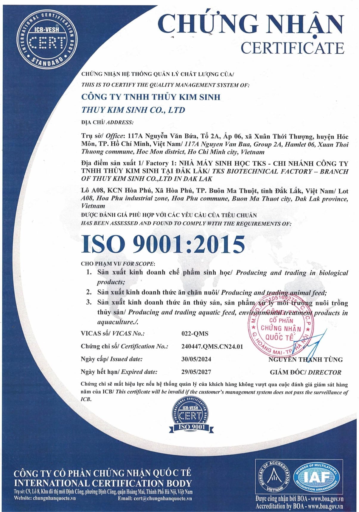 Hệ thống quản lý chất lượng ISO 9001:2015: Đạt chứng nhận quốc tế cho phạm vi sản xuất chế phẩm sinh học, thức ăn chăn nuôi và thủy sản (Số hiệu: 240447.QMS.CN24.01).