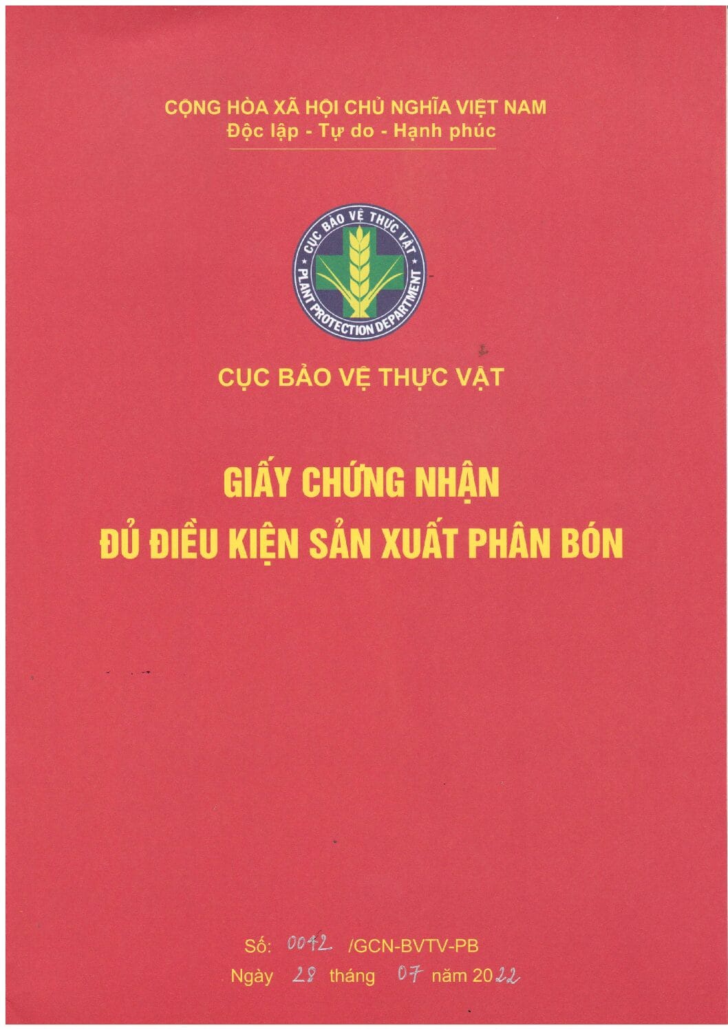 Lĩnh vực Phân bón: Được Cục Bảo vệ Thực vật cấp Giấy chứng nhận đủ điều kiện sản xuất (Số: 0042/GCN-BVTV-PB).