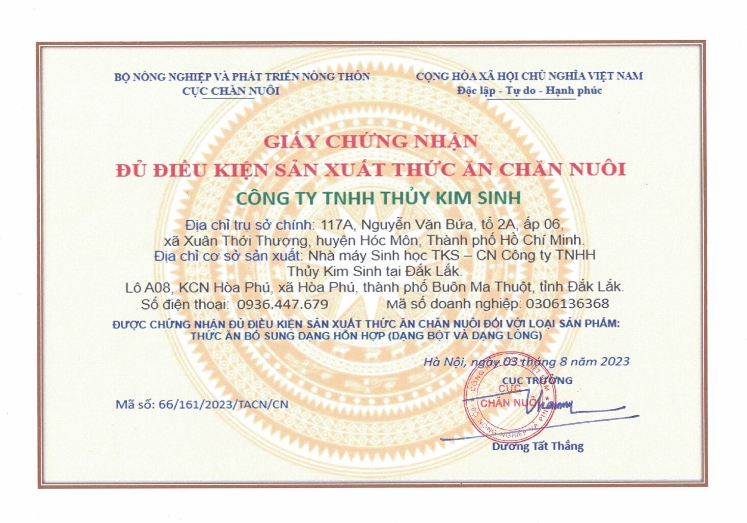 Lĩnh vực Chăn nuôi: Được Cục Chăn nuôi cấp Giấy chứng nhận đủ điều kiện sản xuất thức ăn bổ sung (Mã số: 66/161/2023/TACN/CN).