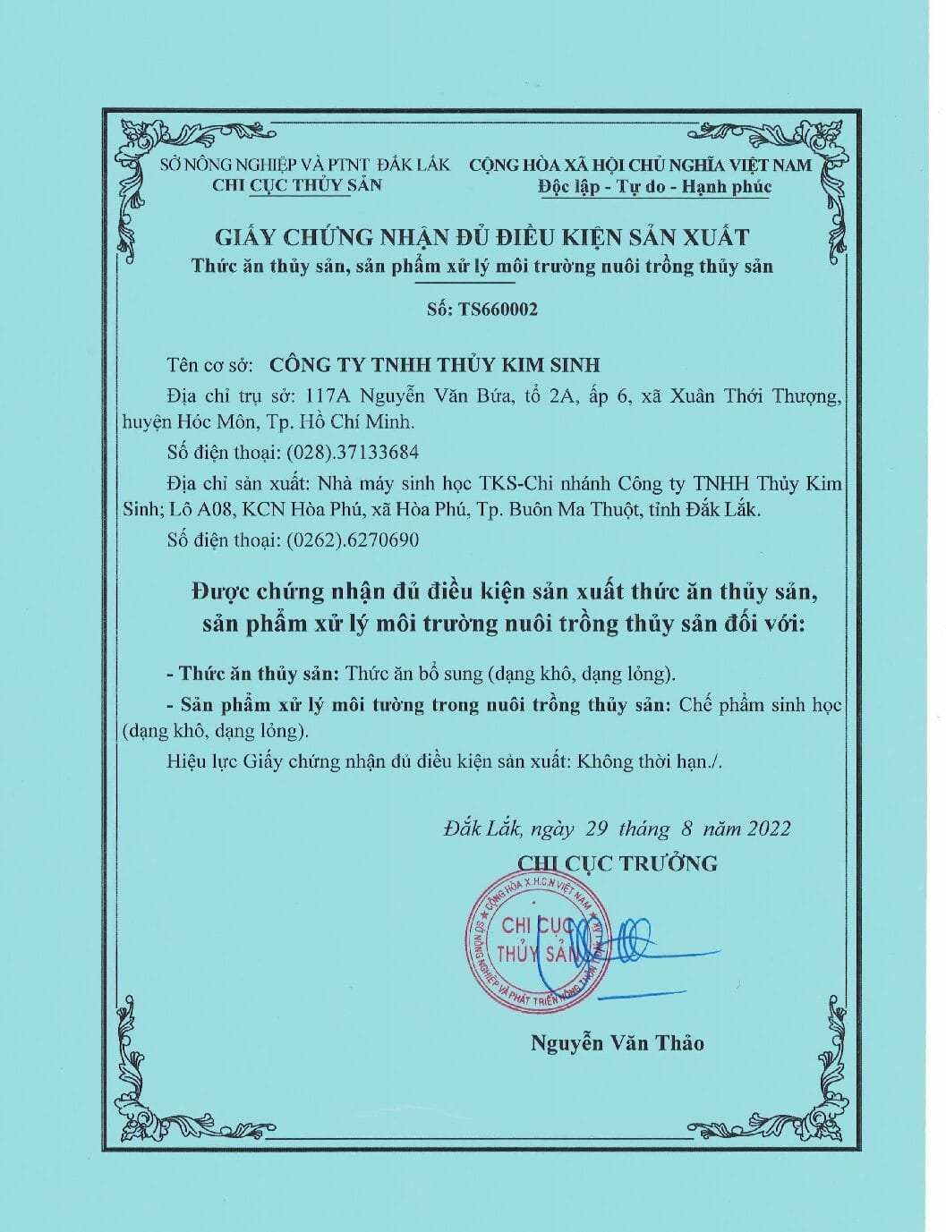 Sự tin cậy của khách hàng tại Biofac được xây dựng trên nền tảng pháp lý vững chắc. Nhà máy Sinh học TKS (Chi nhánh Công ty TNHH Thủy Kim Sinh) tự hào là một trong số ít đơn vị tại khu vực Tây Nguyên sở hữu đầy đủ bộ chứng nhận đủ điều kiện sản xuất từ Cục Bảo vệ Thực vật, Cục Chăn nuôi và đạt tiêu chuẩn chất lượng quốc tế ISO 9001:2015. Đây là lời cam kết đanh thép về chất lượng sản phẩm và sự an tâm tuyệt đối về mặt pháp lý cho mọi đối tác gia công trọn gói.
